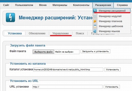 Приступим непосредственно к удалению компонента. Для этого заходим«Расширения» => «Менеджер расширений» и переходим по вкладке «Управление».