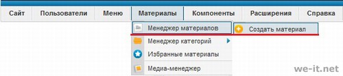Что бы создать материал на движке Joomla нужно перейти в админ-панели Материалы -> Менеджер материалов -> Создать материал.