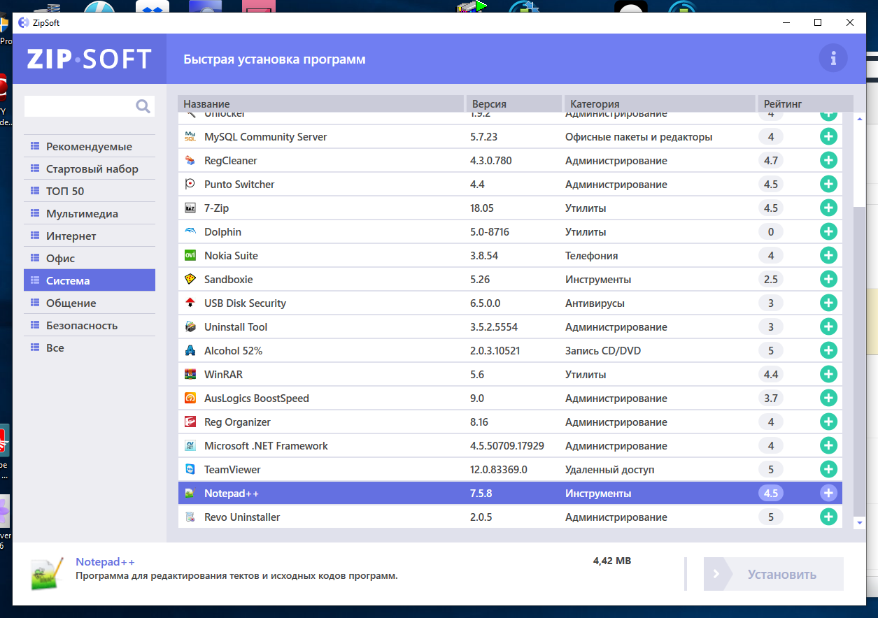 В настоящий момент установщик популярного программного обеспечения ZipSoft поддерживает установку 160 бесплатных и условно-бесплатных приложений, которые обеспечат пользователя всем необходимым для повседневной эксплуатации компьютера и решения любых задач, начиная от просмотра видео и заканчивая установкой сервера баз данных.