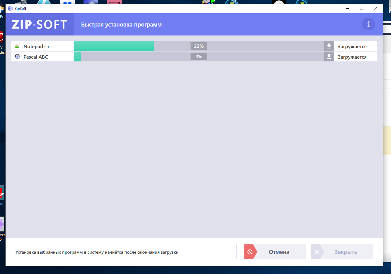 После скачивания пакета он запускается для инсталляции, а следующая программа начинает загружаться. То есть, пока грузится следующее приложение, можно установить и настроить только что скачанное.
